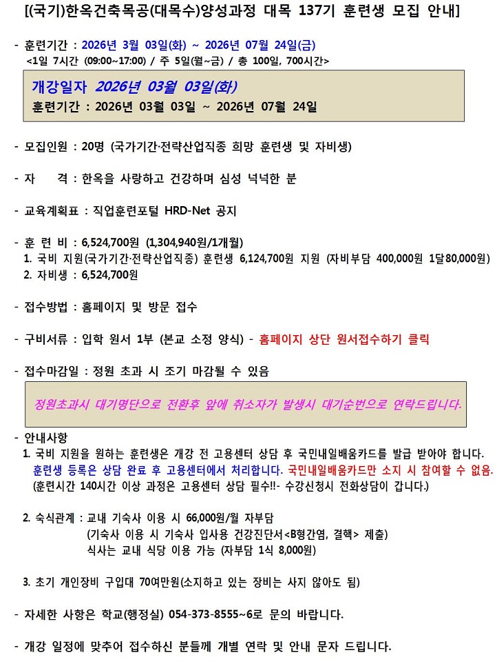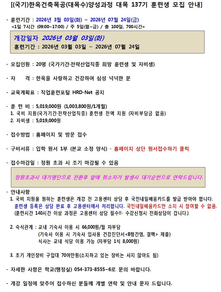 (국기) 한옥건축목공(대목수)과정 대목 137기 훈련생 모집 안내