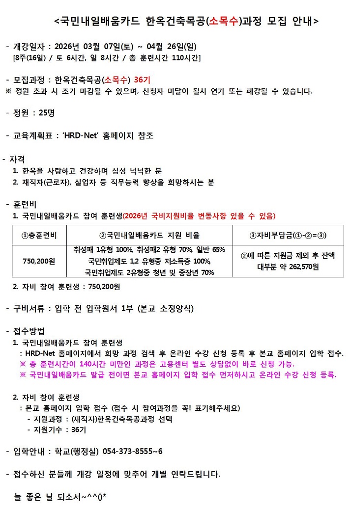근로자(재직자) 한옥건축목공(소목수)과정 모집 안내