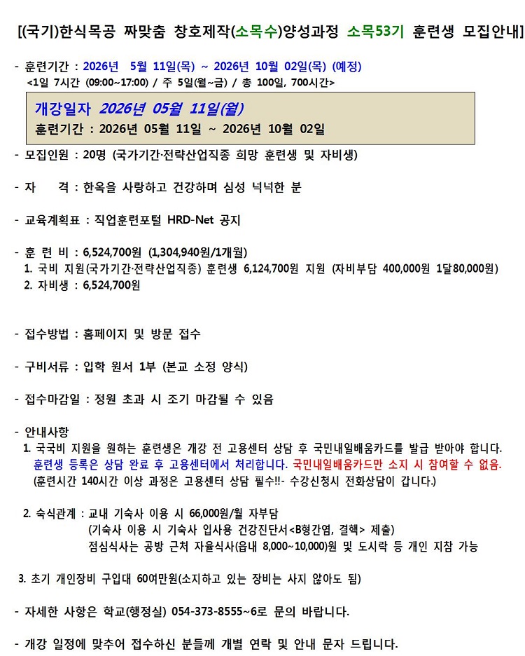(국기) 한식목공 짜맞춤 창호제작(소목수)양성 과정 소목 53기 훈련생 모집 안내